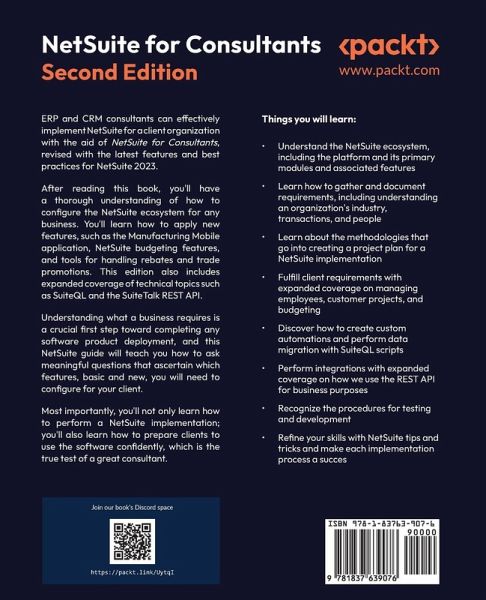 Guide clients through a NetSuite implementation with the latest features in 2023 including gathering requirements, setting up the basics, creating custom automations, and importing data with SuiteQL Key Features: - Pick up the best ways to identify a client's needs by asking the right questions in the initial interviews. - Explore the new features in NetSuite 2023, including the Supply Chain Control Tower for managing inventory and gathering performance reports. - Avoid pitfalls and get the implementation right first time by following the advice of a Consulting Technical Director at Oracle NetSuite. Book Description: ERP and CRM consultants can effectively implement NetSuite for a client organization with the aid of NetSuite for Consultants, revised with the latest features and best practices for NetSuite 2023. After reading this book, you'll have a thorough understanding of how to configure the NetSuite ecosystem for any business. You'll learn how to apply new features such as the Manufacturing Mobile application, NetSuite budgeting features, and tools for handling rebates and trade promotions. This edition also includes expanded coverage of technical topics such as SuiteQL and the SuiteTalk REST API. Understanding what a business requires is a crucial first step toward completing any software product deployment, and this NetSuite guide will teach you how to ask meaningful questions that ascertain which features, basic and new, you will need to configure for your client. Most importantly, you'll not only learn how to perform a NetSuite implementation; you'll also learn how to prepare clients to use the software confidently, which is the true test of a great consultant. What You Will Learn: - Understand the NetSuite ecosystem, including the platform, its primary modules, and associated features. - Learn about the NetSuite foundations and get prepared to utilize it in any company. - Discover how to manage gaps, data migration, and integration with NetSuite. - Utilize the all-new features updates in NetSuite 2022 and 2023. - Find out how to minimize disruptions in finance as you migrate to NetSuite. - Recognize the procedures for setting up the account for your company and how testing and development fit into the implementation plan. - Refine your skills with NetSuite tips and tricks and make each implementation process a success. Who this book is for: This book is aimed at new NetSuite consultants who are tasked with guiding an organization through their NetSuite implementation. To make the most out of this book, you are expected to have already completed the basic NetSuite Foundations training course.