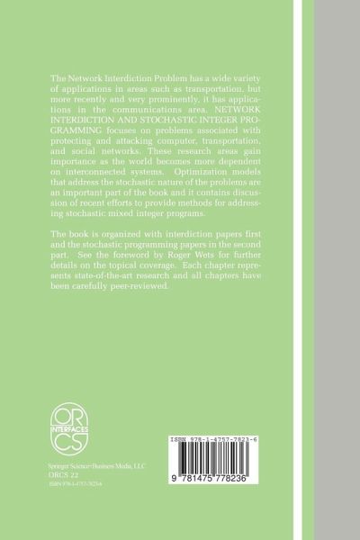 On March 15, 2002 we held a workshop on network interdiction and the more general problem of stochastic mixed integer programming at the University of California, Davis. Jesús De Loera and I co-chaired the event, which included presentations of on-going research and discussion. At the workshop, we decided to produce a volume of timely work on the topics. This volume is the result. Each chapter represents state-of-the-art research and all of them were refereed by leading investigators in the respective fields. Problems - sociated with protecting and attacking computer, transportation, and social networks gain importance as the world becomes more dep- dent on interconnected systems. Optimization models that address the stochastic nature of these problems are an important part of the research agenda. This work relies on recent efforts to provide methods for - dressing stochastic mixed integer programs. The book is organized with interdiction papers first and the stochastic programming papers in the second part. A nice overview of the papers is provided in the Foreward written by Roger Wets.