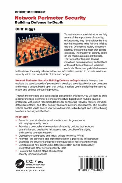 This text reveals how readers can evaluate the security needs of their networks, develop a security policy for their companies, and create a budget based upon that policy. It assists them in designing the security model and outlines the testing process. Through the concepts and case studies presented in this book, they will learn to build a comprehensive perimeter defense architecture based upon multiple layers of protection, with expert recommendations for configuring firewalls, routers, intrusion detection systems, and other security tools and network components. This detailed volume enables readers to secure their networks on time, within budget, and without having to attain a security certification.
