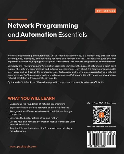 Unleash the power of automation by mastering network programming fundamentals using Python and Go best practices Purchase of the print or Kindle book includes a free PDF eBook Key Features:Understand the fundamentals of network programming and automation Learn tips and tricks to transition from traditional networking to automated networks Solve everyday problems with automation frameworks in Python and Go Book Description: Network programming and automation, unlike traditional networking, is a modern-day skill that helps in configuring, managing, and operating networks and network devices. This book will guide you with important information, helping you set up and start working with network programming and automation. With Network Programming and Automation Essentials, you'll learn the basics of networking in brief. You'll explore the network programming and automation ecosystem, learn about the leading programmable interfaces, and go through the protocols, tools, techniques, and technologies associated with network programming. You'll also master network automation using Python and Go with hands-on labs and real network emulation in this comprehensive guide. By the end of this book, you'll be well equipped to program and automate networks efficiently. What You Will Learn:Understand the foundation of network programming Explore software-defined networks and related families Recognize the differences between Go and Python through comparison Leverage the best practices of Go and Python Create your own network automation testing framework using network emulation Acquire skills in using automation frameworks and strategies for automation Who this book is for: This book is for network architects, network engineers, and software professionals looking to integrate programming into networks. Network engineers following traditional techniques can use this book to transition into modern-day network automation and programming. Familiarity with networking concepts is a prerequisite.
