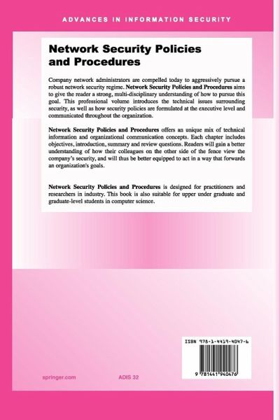 Company network administrators are compelled today to aggressively pursue a robust network security regime. Network Security Policies and Procedures gives the reader a strong, multi-disciplinary understanding of how to pursue this goal.