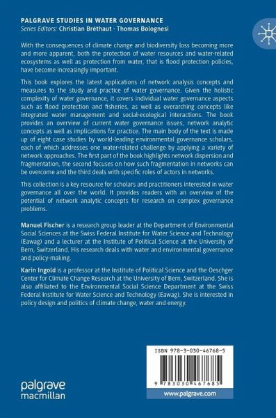 This book explores the latest applications of network analysis concepts and measures to the study and practice of water governance. Given the holistic complexity of water governance, it covers individual water governance aspects such as flood protection and fisheries, as well as overarching concepts like integrated water management and social-ecological interactions. The book provides an overview of current water governance issues, network analytic concepts as well as implications for practice. The main body of the text is made up of eight case studies by world-leading environmental governance scholars, each of which addresses one water-related challenge by applying a variety of networkapproaches. The first part of the book highlights network dispersion and fragmentation, the second focuses on how such fragmentation in networks can be overcome and the third deals with specific roles of actors in networks.