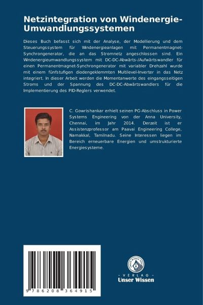 Dieses Buch befasst sich mit der Analyse, der Modellierung und dem Steuerungssystem für Windenergieanlagen mit Permanentmagnet-Synchrongenerator, die an das Stromnetz angeschlossen sind. Ein Windenergieumwandlungssystem mit DC-DC-Abwärts-/Aufwärtswandler für einen Permanentmagnet-Synchrongenerator mit variabler Drehzahl wurde mit einem fünfstufigen diodengeklemmten Multilevel-Inverter in das Netz integriert. In dieser Arbeit werden die Momentanwerte des eingangsseitigen Stroms und der Spannung des DC-DC-Abwärtswandlers für die Implementierung des PID-Reglers verwendet.