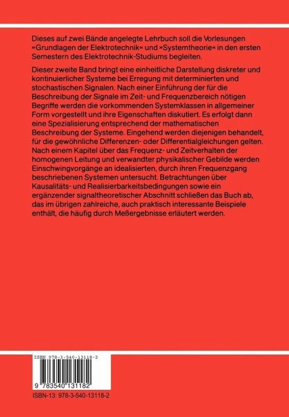 1 Einleitung.- 2 Eigenschaften von Signalen und Systemen.- 2.1 Determinierte Signale.- 2.2 Stochastische Folgen und Funktionen.- 2.3 Systeme.- 2.4 Beschreibung von linearen Systemen im Zeitbereich.- 2.5 Beschreibung von linearen, zeitinvarianten Systemen im Frequenzbereich.- 2.6 Reaktion eines linearen, zeitinvarianten Systems auf ein Zufallssignal.- 2.7 Verlustfreie und verlustbehaftete Systeme.- 2.8 Beispiele.- 2.9 Bemerkungen zu nichtlinearen Systemen.- Literatur.- 3 Kausale Systeme, beschrieben durch gewöhnliche Differenzenoder Differentialgleichungen.- 3.1 Zustandskonzept und Zustandsgleichungen.- 3.2 Lineare, zeitinvariante Systeme.- 3.3 Lineare, zeitvariante Systeme.- 3.4 Allgemeine Systeme.- Literatur.- 4 Lineare, kausale Systeme, beschrieben durch partielle Differentialgleichungen.- 4.1 Vorbemerkungen.- 4.2 Homogene Leitungen.- 4.3 Physikalische Systeme, die zur homogenen Leitung analog sind.- Literatur.- 5 Idealisierte, lineare, zeitinvariante Systeme.- 5.1 Einführung.- 5.2 Verzerrungsfreie Systeme.- 5.3 Impuls- und Sprungantworten idealisierter Systeme.- 5.4 Wechselschaltvorgänge.- 5.5 Kausale Systeme.- 5.6 Ergänzende Aussagen zur Signaltheorie.- Literatur.- A.1 Funktionentheorie.- A.1.1 Holomorphe Funktionen.- A.1.2 Potenzreihen.- A.1.3 Integration.- A.2 Z-Transformation.- A.2.1 Definition und Eigenschaften.- A.2.2 Zweiseitige Z-Transformation.- A.2.3 Die Rücktransformation.- A.3 Einführung in die Distributionentheorie.- A.3.1 Lokal integrable Funktionen.- A.3.2 Die allgemeine Distribution.- A.4 Einführung in die Theorie stochastischer Signale.- A.4.1 Definitionen und grundlegende Beziehungen.- A.4.2 Funktionen einer Zufallsvariablen.- A.4.3 Zwei Zufallsvariablen.- A.5 Fourierreihen.- A.5.1 Definition und grundlegende Beziehungen.- A.5.2Transformationseigenschaften der Fourierreihenentwicklung.- A.6 Diskrete Fouriertransformation.- A.7 Fourierintegrale.- A.7.1 Definition.- A.7.2 Sätze und Eigenschaften der Fouriertransformation.- A.7.3 Fouriertransformation von Distributionen.- A.8 Signalflußgraphen.- Literatur.- Namen- und Sachverzeichnis.