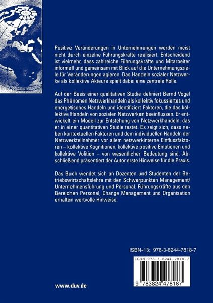 Auf der Basis einer qualitativen Studie definiert Bernd Vogel das Phänomen Netzwerkhandeln als kollektiv fokussiertes und energetisches Handeln und identifiziert Faktoren, die das kollektive Handeln von sozialen Netzwerken beeinflussen. Er entwickelt ein Modell zur Entstehung von Netzwerkhandeln, das er in einer quantitativen Studie testet. Es zeigt sich, dass neben kontextuellen Faktoren und dem individuellen Handeln der Netzwerkteilnehmer vor allem netzwerkinterne Einflussfaktoren - kollektive Kognitionen, kollektive positive Emotionen und kollektive Volition - von wesentlicher Bedeutung sind. Abschließend präsentiert der Autor erste Hinweise für die Praxis.