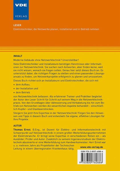 Moderne Gebäude ohne Netzwerktechnik? Unvorstellbar!Viele Elektrotechniker und Installateure benötigen Kenntnisse oder Informationen zur Netzwerktechnik. Sie suchen nach Antworten, aber finden keine, weil sie nicht wissen, wonach sie fragen sollen. Genau hier setzt dieses Buch an: Es unterstützt dabei, die richtigen Fragen zu stellen und einen passenden Lösungsansatz zu finden, um Netzwerkprojekte erfolgreich zu planen und umzusetzen.Dieses Buch richtet sich an Installateure und Elektrotechniker, die sich mit- dem Aufbau,- der Installation und- dem Betriebvon Netzwerktechnik befassen. Als erfahrener Trainer und Praktiker begleitet der Autor den Leser Schritt für Schritt auf seinem Weg in die Netzwerktechnikpraxis. Von den Grundlagen über Adressierung und Verkabelung bis hin zum Betrieb von Netzwerken werden die wesentlichen Aspekte behandelt - einschließlich Kupfer- und Glasfaserstrecken.Steigern Sie jetzt Ihre Expertise in der Netzwerktechnik! Folgen Sie den Hinweisen und Tipps in diesem Buch und entwickeln Sie eigene, effektive Lösungen für Ihre Projekte.