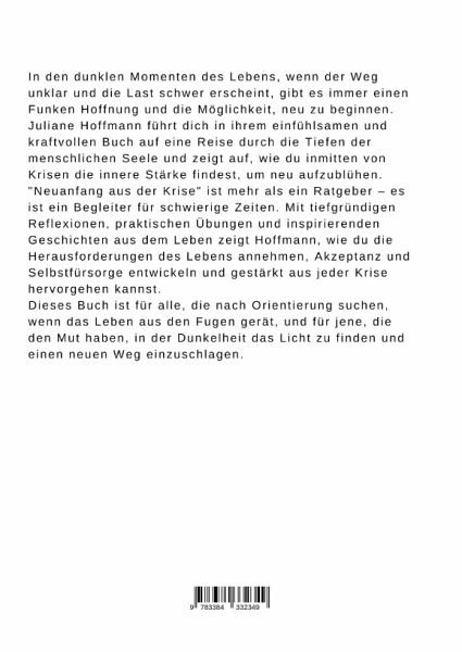 In den dunklen Momenten des Lebens, wenn der Weg unklar und die Last schwer erscheint, gibt es immer einen Funken Hoffnung und die Möglichkeit, neu zu beginnen. Juliane Hoffmann führt dich in ihrem einfühlsamen und kraftvollen Buch auf eine Reise durch die Tiefen der menschlichen Seele und zeigt auf, wie du inmitten von Krisen die innere Stärke findest, um neu aufzublühen."Neuanfang aus der Krise" ist mehr als ein Ratgeber - es ist ein Begleiter für schwierige Zeiten. Mit tiefgründigen Reflexionen, praktischen Übungen und inspirierenden Geschichten aus dem Leben zeigt Hoffmann, wie du die Herausforderungen des Lebens annehmen, Akzeptanz und Selbstfürsorge entwickeln und gestärkt aus jeder Krise hervorgehen kannst.Dieses Buch ist für alle, die nach Orientierung suchen, wenn das Leben aus den Fugen gerät, und für jene, die den Mut haben, in der Dunkelheit das Licht zu finden und einen neuen Weg einzuschlagen.