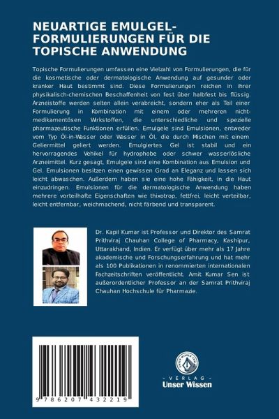 Topische Formulierungen umfassen eine Vielzahl von Formulierungen, die für die kosmetische oder dermatologische Anwendung auf gesunder oder kranker Haut bestimmt sind. Diese Formulierungen reichen in ihrer physikalisch-chemischen Beschaffenheit von fest über halbfest bis flüssig. Arzneistoffe werden selten allein verabreicht, sondern eher als Teil einer Formulierung in Kombination mit einem oder mehreren nicht-medikamentösen Wirkstoffen, die unterschiedliche und spezielle pharmazeutische Funktionen erfüllen. Emulgele sind Emulsionen, entweder vom Typ Öl-in-Wasser oder Wasser in Öl, die durch Mischen mit einem Geliermittel geliert werden. Emulgiertes Gel ist stabil und ein hervorragendes Vehikel für hydrophobe oder schwer wasserlösliche Arzneimittel. Kurz gesagt, Emulgele sind eine Kombination aus Emulsion und Gel. Emulsionen besitzen einen gewissen Grad an Eleganz und lassen sich leicht abwaschen. Außerdem haben sie eine hohe Fähigkeit, in die Haut einzudringen. Emulsionen für die dermatologische Anwendung haben mehrere vorteilhafte Eigenschaften wie thixotrop, fettfrei, leicht verteilbar, leicht entfernbar, weichmachend, nicht färbend und transparent.