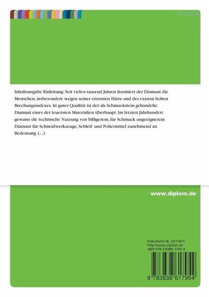 Nach einer kurzen Einleitung im ersten Kapitel wird im zweiten Kapitel ein umfassender Überblick über die gängigen Möglichkeiten zur Diamantsynthese gegeben und revolutionäre Forschungsergebnisse zur Diamantsynthese aus jüngster Zeit präsentiert.