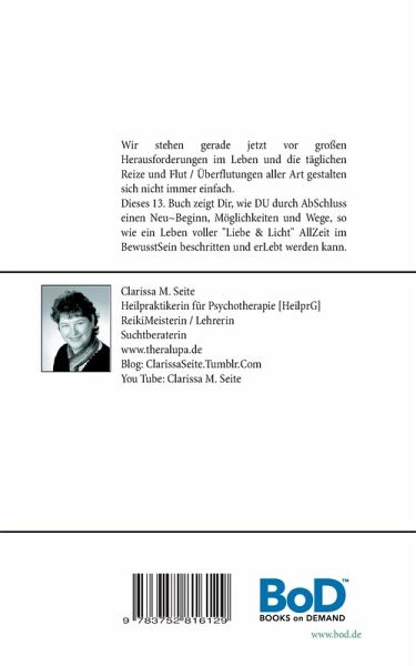 Wir stehen gerade jetzt vor großen Herausforderungen im Leben und die täglichen Reize und Flut / Überflutungen aller Art gestalten sich nicht immer einfach.Dieses 13. Buch zeigt Dir, wie DU durch AbSchluss einen Neu~Beginn, Möglichkeiten und Wege, so wie ein Leben voller "Liebe & Licht" AllZeit im BewusstSein beschritten und erLebt werden kann. Vereinigung auf einer Ebene im "Einz Sein".