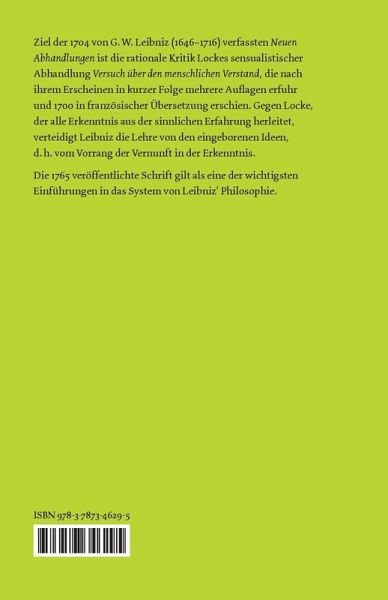 Ziel der 1704 von G.¿W. Leibniz (1646¿1716) verfassten "Neuen Abhandlungen" ist die rationale Kritik Lockes sensualistischer Abhandlung "Versuch über den menschlichen Verstand", die nach ihrem Erscheinen in kurzer Folge mehrere Auflagen erfuhr und 1700 in französischer Übersetzung erschien. Gegen Locke, der alle Erkenntnis aus der sinnlichen Erfahrung herleitet, verteidigt Leibniz die Lehre von den eingeborenen Ideen, d.¿h. vom Vorrang der Vernunft in der Erkenntnis. Die 1765 veröffentlichte Schrift gilt als eine der wichtigsten Einführungen in das System von Leibniz¿ Philosophie.