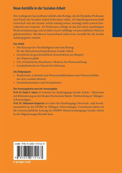 Der vorliegende Sammelband enthält zehn Beträge, die die Disziplin, Profession und Praxis der Sozialen Arbeit befruchten sollen. Als Handlungswissenschaft entwickelt sich die Soziale Arbeit ständig weiter, benötigt dafür jedoch fortwährend neue Impulse. Als Profession verfolgt sie das Ziel einer nachhaltigen Professionalisierung, und ist daher durch vielfältige wissenschaftliche Diskurse gekennzeichnet. Mit diesem Sammelband sollen neue Anstöße für die Soziale Arbeit gegeben werden.