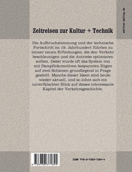 Die Aufbruchstimmung und der technische Fortschritt im 19. Jahrhundert führten zu immer neuen Erfindungen, die den Verkehr beschleunigen und die Antriebe optimieren sollten. Dabei wurde oft das System von mit Dampflokomotiven bespannten Zügen auf zwei Schienen grundlegend in Frage gestellt. Manche dieser Ideen sind heute wieder aktuell, und so lohnt sich ein unverfälschter Blick auf dieses interessante Kapitel der Verkehrsgeschichte.