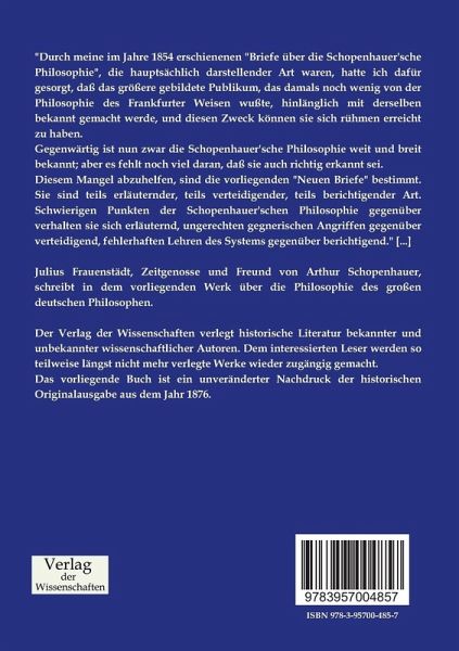 Diesem Mangel abzuhelfen, sind die vorliegenden "Neuen Briefe" bestimmt. Sie sind teils erläuternder, teils verteidigender, teils berichtigender Art. Schwierigen Punkten der Schopenhauer'schen Philosophie gegenüber verhalten sie sich erläuternd, ungerechten gegnerischen Angriffen gegenüber verteidigend, fehlerhaften Lehren des Systems gegenüber berichtigend." [...]