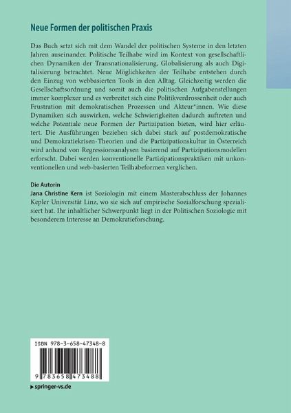 Aufgabenstellungen immer komplexer und es verbreitet sich eine Politikverdrossenheit oder auch Frustration mit demokratischen Prozessen und Akteur_innen. Wie diese Dynamiken sich auswirken, welche Schwierigkeiten dadurch auftreten und welche Potentiale neue Formen der Partizipation bieten, wird hier erläutert. Die Ausführungen beziehen sich dabei stark auf postdemokratische und Demokratiekrisen-Theorien und die Partizipationskultur in Österreich wird anhand von Regressionsanalysen basierend auf Partizipationsmodellen erforscht. Dabei werden konventionelle Partizipationspraktiken mit unkonventionellen und web-basierten Teilhabeformen verglichen.
