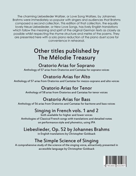 The charming Liebeslieder Waltzer, or Love Song Waltzes, by Johannes Brahms were immediately so popular with singers and audiences that Brahms composed a second collection. This edition of that collection, the equally lovely Neue Liebeslieder, or New Love Songs, has English translations which follow the meaning and spirit of the original German texts as closely as possible whilst respecting the rhyme structure and metre of the poems. They are presented here with a solo piano reduction of the piano duet score for convenience in rehearsal. For clarity, the German text is not included.