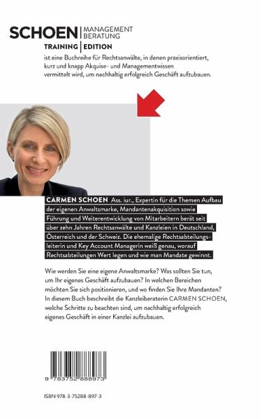 SCHOEN Managementberatung, Training Edition, ist eine Buchreihe für Rechtsanwälte, in denen praxisorientiert, kurz und knapp Akquise- und Managementwissen vermittelt wird, um nachhaltig erfolgreich Geschäft aufzubauen.Wie werden Sie eine eigene Anwaltsmarke? Was sollten Sie tun, um Ihr eigenes Geschäft aufzubauen? In welchen Bereichen möchten Sie sich positionieren, und wo finden Sie Ihre Mandanten?In diesem Buch beschreibt die Kanzleiberaterin Carmen Schoen, welche Schritte zu beachten sind, um nachhaltig erfolgreich eigenes Geschäft in einer Kanzlei aufzubauen.