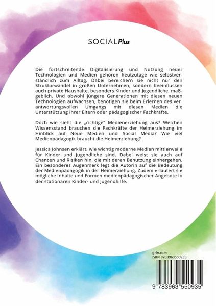 Die fortschreitende Digitalisierung und Nutzung neuer Technologien und Medien gehören heutzutage wie selbstverständlich zum Alltag. Dabei bereichern sie nicht nur den Strukturwandel in großen Unternehmen, sondern beeinflussen auch private Haushalte, besonders Kinder und Jugendliche, maßgeblich. Und obwohl jüngere Generationen mit diesen neuen Technologien aufwachsen, benötigen sie beim Erlernen des verantwortungsvollen Umgangs mit diesen Medien die Unterstützung ihrer Eltern oder pädagogischer Fachkräfte. Doch wie sieht die ¿richtige¿ Medienerziehung aus? Welchen Wissensstand brauchen die Fachkräfte der Heimerziehung im Hinblick auf Neue Medien und Social Media? Wie viel Medienpädagogik braucht die Heimerziehung? Jessica Johnsen erklärt, wie wichtig moderne Medien mittlerweile für Kinder und Jugendliche sind. Dabei weist sie auch auf Chancen und Risiken hin, die mit deren Benutzung einhergehen. Ein besonderes Augenmerk legt die Autorin auf die Bedeutung der Medienpädagogik in der Heimerziehung. Zudem erläutert sie mögliche Inhalte und Formen medienpädagogischer Angebote in der stationären Kinder- und Jugendhilfe. Aus dem Inhalt: - Medienkompetenz; - Meinungsbildung; - Identitätsbildung; - Internet; - Selbstdarstellung; - Kommunikation