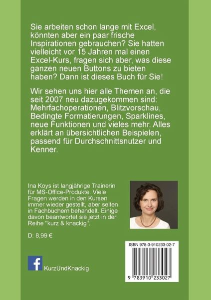 Sie arbeiten schon lange mit Excel, könnten aber ein paar frische Inspirationen gebrauchen? Sie hatten vielleicht vor 15 Jahren mal einen Excel-Kurs, fragen sich aber, was diese ganzen neuen Buttons zu bieten haben? Dann ist dieses Buch für Sie! Wir sehen uns hier alle Themen an, die seit 2007 neu dazugekommen sind: Mehrfachoperationen, Blitzvorschau, Bedingte Formatierungen, Sparklines, neue Funktionen und vieles mehr. Alles erklärt an übersichtlichen Beispielen, passend für Durchschnittsnutzer und Kenner.