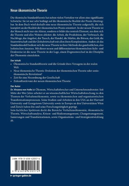 Die ökomische Standardtheorie hat neben vielen Vorteilen vor allem eine signifikante Schwäche: Sie ist nur sehr bedingt auf die ökonomische Realität der Praxis übertragbar. In dem Buch wird deshalb eine neue ökonomische Theorie aufgestellt, die sich komplett an der Realität der ökonomischen Praxis orientiert. In der neuen Theorie ist der Mensch nicht nur ein Akteur, sondern er bildet das zentrale Element, aus dem sich die Theorie und alles Weitere ableitet: die Arbeit, die Produktion, der Verbrauch, die Nachfrage, das Angebot, der Tausch, der Handel, die Märkte, die Börsen, das Geld, die Staatswirtschaft und die Globalwirtschaft mit allen ihren Komplexitäten. Anders als das Standardmodell bedient sich die neue Theorie in ihrer Methode des ganzheitlichen, also holistischen Ansatzes. Mit dieser neuen und differenzierten ökonomischen Sicht- und Denkweise ist die neue Theorie in der Lage, einen Dogmenwechsel in der Disziplin der Ökonomie einzuleiten.