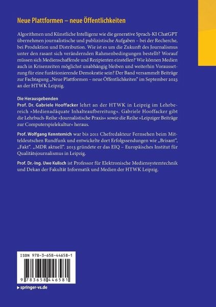 Prof. Dr. Gabriele Hooffacker lehrt an der HTWK in Leipzig im Lehrbereich 'Medienadäquate Inhalteaufbereitung'. Gabriele Hooffacker gibt die Lehrbuch-Reihe 'Journalistische Praxis' sowie die Reihe 'Leipziger Beiträge zur Computerspielekultur' heraus. Prof. Wolfgang Kenntemich war bis 2011 Chefredakteur Fernsehen beim Mitteldeutschen Rundfunk und entwickelte dort Erfolgssendungen wie "Brisant", "Fakt". "MDR aktuell". 2013 gründete er das EIQ - Europäisches Institut für Qualitätsjournalismus in Leipzig. Prof. Dr.-Ing. Uwe Kulisch ist Professor für Elektronische Mediensystemtechnik und Dekan der Fakultät Informatik und Medien der HTWK Leipzig.