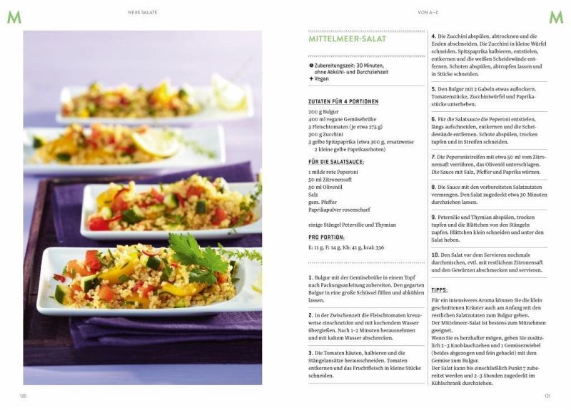 Neue Lieblingssalate für alle. Gibt es ein Wort für das perfekte Sommeressen? Aber natürlich: Salat! Da ist einfach alles drin, worauf man Lust hat, wenn es wieder wärmer wird: Zartes, Knackiges und Erfrischendes. Junges Gemüse, feine Kräuter, viele, viele bunte Zutaten frisch aus dem Garten. Und weil Salate die perfekte Bühne für tolle Kombinationen sind, haben Trendzutaten wie Couscous, Bulgur, Tofu oder Seitan darin jetzt ihren großen Auftritt! Schnelle, leichte Sommerküche - das spricht jeden an! Das mag die ganze Familie: Salate als Hauptgericht oder Beilage. Für Trendsetter mit Faible für vegane Zutaten, Superfoods, Raw Food und Health Food. Und natürlich für alle Sammler der beliebten Dr. Oetker A-Z Reihe! Salate satt: Über 150 knackfrische Rezepte - zum Sattessen oder einfach als Beilage. Salatideen für jeden Geschmack und jeden Anlass. Neukreationen für die Grillsaison, kalorienarme Salate, schnelle Salate (unter 30 Min.), Salate mit Superfoods, mit Getreide und Hülsenfrüchten, Salate mit Fleisch, Wurst und Schinken, vegane Salate, Salate mit Fisch und Meeresfrüchten - und nicht zu vergessen: klassische Lieblinge wie Kartoffel-, Nudel-, Eier- und Käsesalat.