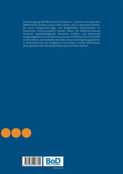 Die Vereinigung STADTBILD DEUTSCHLAND e.V. möchte in der deutschen Öffentlichkeit das Bewusstsein dafür stärken, dass in deutschen Städten, die durch Kriegszerstörungen und fehlgeleiteten Wiederaufbau ihr historisches Erscheinungsbild verloren haben, die Wiederherstellung einstmals stadtbildprägender Bauwerke, Straßen- und Platzräume dringend geboten ist.. Darüberhinaus verweist STADTBILD DEUTSCHLAND auf Architekten und Architekturkonzepte, die das derzeitige Baugeschehen in Deutschland aus der Sackgasse eines trivialen und die Identität des Ortes ignorierenden Allerwelts-Rationalismus führen können.