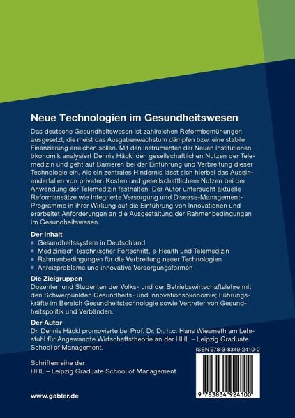 Das deutsche Gesundheitswesen ist zahlreichen Reformbemühungen ausgesetzt, die meist das Ausgabenwachstum dämpfen bzw. eine stabile Finanzierung erreichen sollen. Mit den Instrumenten der Neuen Institutionenökonomik analysiert Dennis Häckl den gesellschaftlichen Nutzen der Telemedizin und geht auf Barrieren bei der Einführung und Verbreitung dieser Technologie ein. Als ein zentrales Hindernis lässt sich hierbei das Auseinanderfallen von privaten Kosten und gesellschaftlichem Nutzen bei der Anwendung der Telemedizin festhalten. Der Autor untersucht aktuelle Reformansätze wie Integrierte Versorgung und Disease-Management-Programme in ihrer Wirkung auf die Einführung von Innovationen und erarbeitet Anforderungen an die Ausgestaltung der Rahmenbedingungen im Gesundheitswesen.