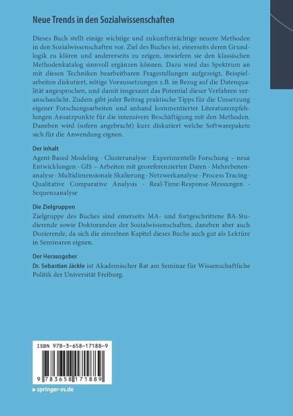 Dieses Buch stellt einige wichtige und zukunftsträchtige neuere Methoden in den Sozialwissenschaften vor. Ziel des Buches ist, einerseits deren Grundlogik zu klären und andererseits zu zeigen, inwiefern sie den klassischen Methodenkatalog sinnvoll ergänzen können. Dazu wird das Spektrum an mit diesen Techniken bearbeitbaren Fragestellungen aufgezeigt, Beispielarbeiten diskutiert, nötige Voraussetzungen z.B. in Bezug auf die Datenqualität angesprochen, und damit insgesamt das Potential dieser Verfahren veranschaulicht. Zudem gibt jeder Beitrag praktische Tipps für die Umsetzung eigener Forschungsarbeiten und anhand kommentierter Literaturempfehlungen Ansatzpunkte für die intensivere Beschäftigung mit den Methoden. Daneben wird (sofern angebracht) kurz diskutiert welche Softwarepakete sich für die Anwendung eignen.