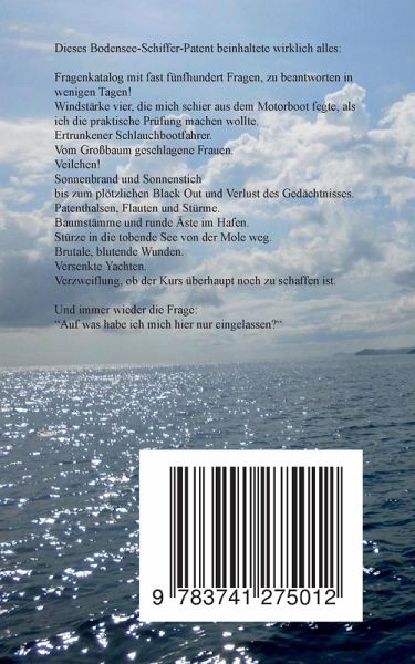 Dieses Bodensee-Schiffer-Patent beinhaltete wirklich alles:Fragenkatalog mit fast fünfhundert Fragen, zu beantworten in wenigen Tagen!Windstärke vier, die mich schier aus dem Motorboot fegte, als ich die praktische Prüfung machen wollte.Ertrunkene Schlauchbootfahrer.Vom Großbaum geschlagene Frauen.Veilchen.Sonnenbrand und Sonnenstich bis zum plötzlichen Black Out und Verlust des Gedächtnisses.Patenthalsen, Flauten und Stürme.Baumstämme und Äste im Hafen.Stürze in die tobende See von der Mole weg.Brutale, blutende Wunden.Versenkte Yachten.Verzweiflung, ob der Kurs überhaupt noch zu schaffen ist.Und immer wieder die Frage: "Auf was habe ich mich hier eingelassen?"