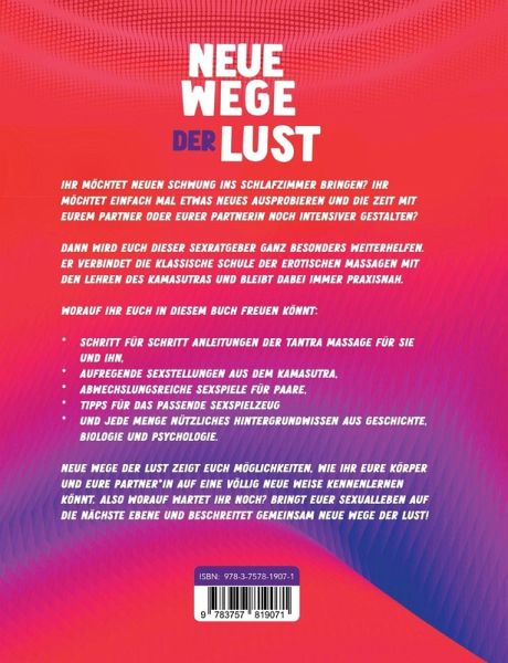 Ihr möchtet neuen Schwung ins Schlafzimmer bringen? Ihr möchtet einfach mal etwas Neues ausprobieren und die Zeit mit eurem Partner oder eurer Partnerin noch intensiver gestalten?Dann wird euch dieser Sexratgeber ganz besonders dabei helfen. Er verbindet die klassische Schule der erotischen Massagen mit den Lehren des Kamasutras und bleibt dabei immer praxisnah. Worauf ihr euch in diesem Buch freuen könnt: Schritt für Schritt Anleitungen der Tantra Massage für Sie und Ihn, aufregende Sexstellungen aus dem Kamasutra, abwechslungsreiche Sexspiele für Paare, Tipps für das passende Sexspielzeug und jede Menge nützliches Hintergrundwissen aus Geschichte, Biologie und Psychologie.Neue Wege der Lust zeigt euch Möglichkeiten, wie ihr eure Körper und eure Partner_in auf eine völlig neue Weise kennenlernen könnt. Also worauf wartet ihr noch? Bringt euer Sexualleben auf die nächste Ebene und beschreitet gemeinsam neue Wege der Lust