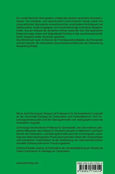 Der zweite Band der Monographie umfasst das deutsch-spanische Verbvalenzlexikon. Die kontrastiv und valenzfundiert beschriebenen Verben sowie ihre zielsprachlichen Äquivalente veranschaulichen verschiedene Verbklassen und Satzbaupläne, Ergänzungstypen und verschiedenartige kontrastive Begebenheiten. Aus der Analyse der deutschen Verben sowie der über 500 spanischen Entsprechungen lassen sich tiefgreifende Einblicke in den sprachwissenschaftlichen Vergleich beider Sprachen gewinnen.