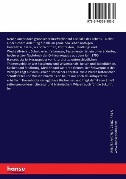 Neuer kurzer doch gründlicher Briefsteller auf alle Fälle des Lebens - Nebst einer sichern Anleitung für alle im gemeinen Leben nöthigen Geschäftsaufsäze , als Bittschriften, Kontrakten, Handlungs und Wechselbriefen, Schuldverschreibungen, Testamenten ist ein unveränderter, hochwertiger Nachdruck der Originalausgabe aus dem Jahr 1790.