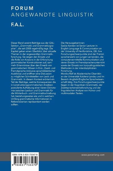 Neuere Entwicklungen in der angewandten Grammatikforschung: Korpusbasierte Studien grammatischer Konstruktionen - Überlegungen zu Grammatikalität, Akzeptabilität und Norm am Beispiel von Entscheidungsfragen im Englischen - Hingehen und V und go and V in deutscher und englischer Sprache · über Grammatikalisierung und Formelhaftigkeit - Gelegentliche Gedanken zum have-Perfekt und zur be-going-to-Form aus kognitiv-funktionaler Sicht - Grammatikerwerb und Grammatikunterricht in Erst-, Zweit- und Fremdsprache - Sprachliche Perspektivierungsmuster des Englischen: Struktur, Erwerb, kognitive und interaktionale Grundlagen - Infinite Komplementkonstruktionen im Englischen und Deutschen aus fremdsprachendidaktischer Perspektive - Wie viel SVO-Input brauchen VO-MuttersprachlerInnen für den Erwerb deutscher SVO-Strukturen? Eine angewandte linguistische Studie im DaF-Anfangsunterricht - Schnittstellen von Lexik und Grammatik - Konstruktionen in DaF-Lernwörterbüchern - Zur Integration von Komposita in deutschsprachige Kollokationenwörterbücher - Traditionen der Darstellung grammatischer Varianz in Sprachschwierigkeitenwörterbüchern vom 19. bis zum 21. Jahrhundert