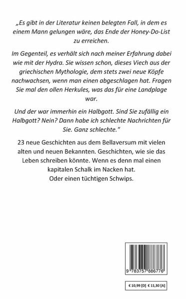 Irgendwo in der norddeutschen Provinz treffen Bella und Heini, aus dessen Perspektive diese Geschichten erzählt wird, aufei-nander.Man kommt sich sehr schnell sehr nahe und nach einigen ebenso überraschenden wie turbulenten Ereignissen finden sich die beiden als Besitzer eines überregional bekannten Puffs und Swingerclubs wieder. Hier beginnen die neuen Geschichten in diesem Buch.Das Leben im Bellaversum ist bunt, kurios, chaotisch, lustig, manchmal dramatisch und gelegentlich auch frivol. Aber niemals langweilig. Sehr zu Heinis Bedauern.Wir treffen alte Bekannte und neue Verwandte, Prinz Eisenherz, eine Maus namens Meikel, einen Toaster namens Röstfried und natürlich die "O". Freuen Sie sich auf bewegende Dramen aus der Norddeutschen Tiefebene.Dieser zweite Sammelband enthält 29 neue Geschichten aus dem Bellaversum. Die 35 bereits erschienen finden sich u.a. im ersten Sammelband "Alles Bella".