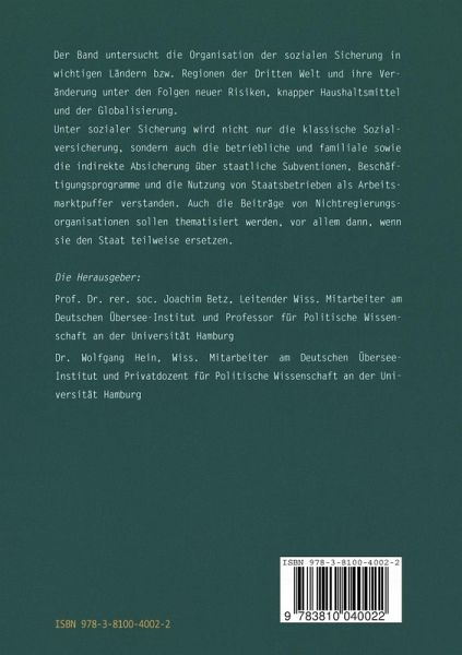 Der Band untersucht die Organisation der sozialen Sicherung in wichtigen Ländern bzw. Regionen der Dritten Welt und ihre Veränderung unter den Folgen neuer Risiken, knapper Haushaltsmittel und der Globalisierung. Unter sozialer Sicherung wird nicht nur die klassische Sozialversicherung, sondern auch die betriebliche und familiale sowie die indirekte Absicherung über staatliche Subventionen, Beschäftigungsprogramme und die Nutzung von Staatsbetrieben als Arbeitsmarktpuffer verstanden. Auch die Beiträge von Nichtregierungsorganisationen sollen thematisiert werden, vor allem dann, wenn sie den Staat teilweise ersetzen.