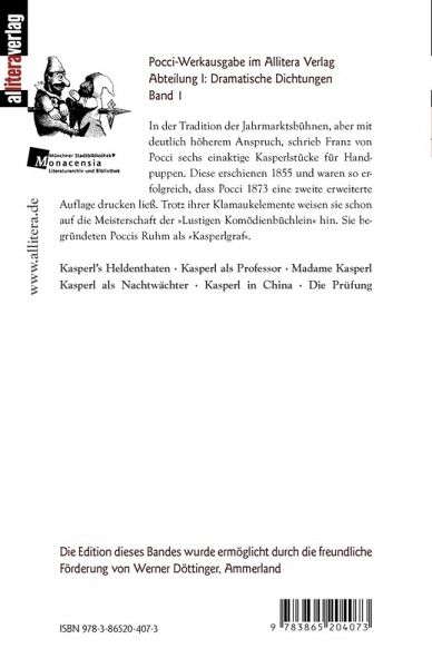 Sechs Spektakelstücke, die noch für das Puppentheater der Jahrmärkte geschrieben wurden. Sie lassen mit all ihrem Klamauk schon die spätere Meisterschaft Poccis in seinen Kasperlkomödien erkennen. Inhalt: Kasperl Heldenthaten. Ein Ritterstück aus dem finstern Mittelalter Kasperl al Professor. Ein philosophisches Lustspiel Madame Kasperl. Ein Schauspiel, in welchem auch der Teufel in Person vorkommt Kasperl als Nachtwächter. Ein Nachtstück Kasperl in China Die Prüfung. Ein beispielloses Spektakelstück