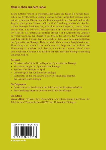 Leona Litterst vereint in systematischer Weise die Frage, ob mittels Techniken der Synthetischen Biologie "neues Leben" hergestellt werden kann, mit der ethischen Dimension, ob dieses hergestellt werden soll und welche Regeln dabei gelten. Hierzu stellt sie fünf Forschungsansätze der Synthetischen Biologie detailliert dar, beleuchtet deren Anspruch, "neues Leben" herzustellen, und bewertet Risikopotentiale in ethisch-anthroporelationaler Hinsicht. Sie untersucht zentrale ethische und systematische Aspekte zu Verantwortung, den Begriffen des Spiels, des Lebens, der Natürlichkeit und Künstlichkeit sowie dem moralischen Status von Forschungsobjekten der Synthetischen Biologie. Dabei wird deutlich, dass die Möglichkeit einer Herstellung von "neuem Leben" nicht nur eine Frage nach der technischen Umsetzung ist, sondern auch danach, wie wir mit "neuem Leben" sowie den möglichen Chancen und Risiken der Synthetischen Biologie zukünftig umgehen wollen.