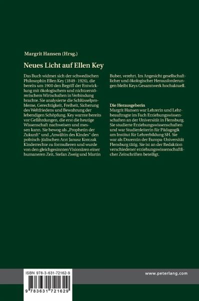 Das Buch widmet sich der schwedischen Philosophin Ellen Key (1849-1926), die bereits um 1900 den Begriff der Entwicklung mit ökologischem und nichtzerstörerischem Wirtschaften in Verbindung brachte. Sie analysierte die Schlüsselprobleme, Gerechtigkeit, Freiheit, Sicherung des Weltfriedens und Bewahrung der lebendigen Schöpfung. Key warnte bereits vor Gefährdungen, die erst die heutige Wissenschaft nachweisen und messen kann. Sie bewog als «Prophetin der Zukunft» und «Anwältin des Kindes» den polnisch-jüdischen Arzt Janusz Korczak Kinderrechte zu formulieren und wurde von den gleichgesinnten Visionären einer humaneren Zeit, Stefan Zweig und Martin Buber, verehrt. Im Angesicht gesellschaftlicher und ökologischer Herausforderungen bleibt Keys Gesamtwerk hochaktuell.