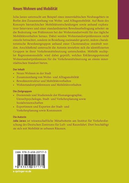 Julia Jarass untersucht am Beispiel eines innerstädtischen Neubaugebiets in Berlin den Zusammenhang von Wohn- und Alltagsmobilität. Auf Basis des Konzepts hierarchischer Mobilitätsentscheidungen sowie anhand explorativer Interviews und einer standardisierten Bewohnerbefragung arbeitet sie die Bedeutung von Präferenzen bei der Wohnstandortwahl für das tägliche Mobilitätsverhalten heraus. Dabei werden Wohnstandortpräferenzen nicht einzeln betrachtet, sondern in Beziehung zueinander gesetzt, indem charakteristische Bewohnergruppen anhand einer Clusteranalyse ermittelt werden. Anschließend untersucht die Autorin inwiefern sich die identifizierten Gruppen in ihrer Verkehrsmittelnutzung unterscheiden. Mithilfe multipler Regressionsmodelle wird dabei geprüft, welches Erklärungspotenzial Wohnstandortpräferenzen für die Verkehrsmittelnutzung an einem innerstädtischen Standort bieten.