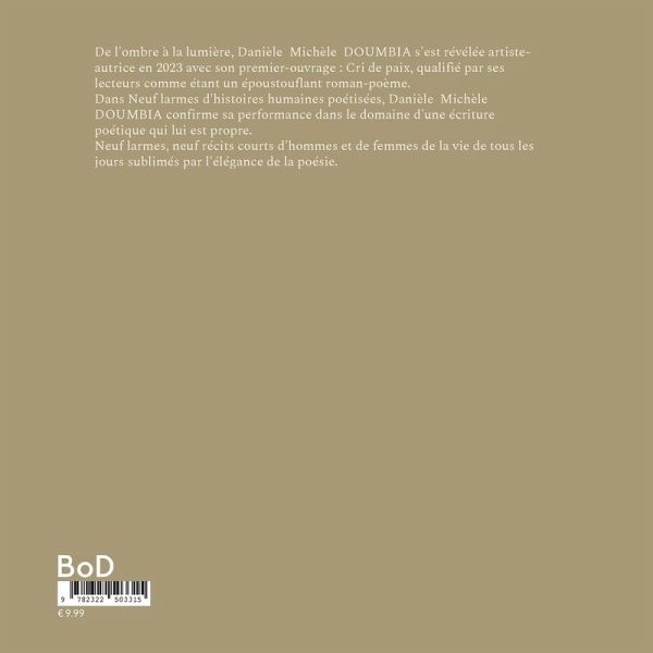 De l'ombre à la lumière, Danièle Michèle DOUMBIA s'est révélée artiste-autrice en 2023 avec son premier ouvrage: CRI DE PAIX, qualifié par ses lecteurs comme étant un époustouflant roman-poème. Dans Neuf larmes d'histoires humaines poétisées, Danièle Michèle DOUMBIA confirme sa performance dans le domaine d'une écriture poétique qui lui est propre. Neuf larmes, neuf récits courts de femmes et d'hommes de la vie de tous les jours sublimés par l'élégance de la poésie.