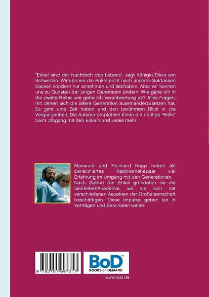 "Enkel sind der Nachtisch des Lebens", sagt Königin Silvia von Schweden. Wir können die Enkel nicht nach unserm Gutdünken backen sondern nur annehmen und liebhaben. Aber wir können uns zu Gunsten der jungen Generation ändern. Wie gehe ich in die zweite Reihe, wie gebe ich Verantwortung ab? Alles Fragen, mit denen sich die ältere Generation auseinanderzusetzen hat. Es geht ums Zeit haben und den berühmten Blick in die Vergangenheit. Die Autoren empfehlen Ihnen die richtige "Brille" beim Umgang mit den Enkeln und vieles mehr.