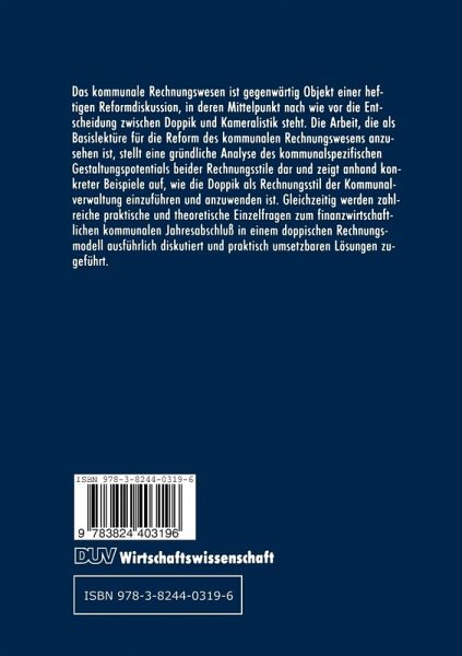 Das kommunale Rechnungswesen ist gegenwärtig Objekt einer heftigen Reformdiskussion, in deren Mittelpunkt nach wie vor die Entscheidung zwischen Doppik und Kameralistik steht. Die Arbeit, die als Basislektüre für die Reform des kommunalen Rechnungswesens anzusehen ist, stellt eine gründliche Analyse des kommunalspezifischen Gestaltungspotentials beider Rechnungsstile dar und zeigt anhand konkreter Beispiele auf, wie die Doppik als Rechnungsstil der Kommunalverwaltung einzuführen und anzuwenden ist. Gleichzeitig werden zahlreiche praktische und theoretische Einzelfragen zum finanzwirtschaftlichen kommunalen Jahresabschluß in einem doppischen Rechnungsmodell ausführlich diskutiert und praktisch umsetzbaren Lösungen zugeführt.