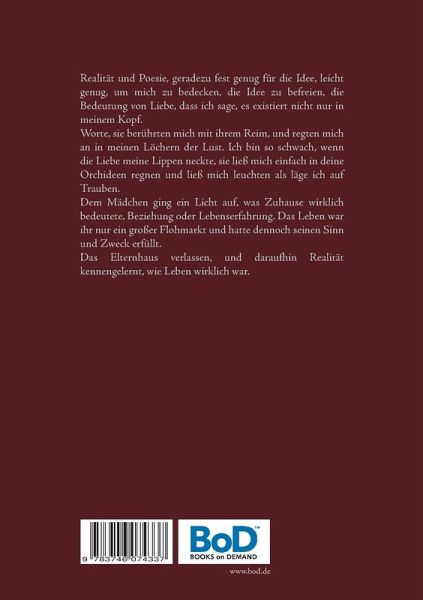 Realität und Poesie, geradezu fest genug für die Idee, leicht genug, um mich zu bedecken, die Idee zu befreien, die Bedeutung von Liebe, dass ich sage, es existiert nicht nur in meinem Kopf. Worte, sie berührten mich mit ihrem Reim, und regten mich an in meinen Löchern der Lust. Ich bin so schwach, wenn die Liebe meine Lippen neckte, sie ließ mich einfach in deine Orchideen regnen und ließ mich leuchten als läge ich auf Trauben.Dem Mädchen ging ein Licht auf, was Zuhause wirklich bedeutete, Beziehung oder Lebenserfahrung. Das Leben war ihr nur ein großer Flohmarkt und hatte dennoch seinen Sinn und Zweck erfüllt. Das Elternhaus verlassen, und daraufhin Realität kennengelernt, wie Leben wirklich war.