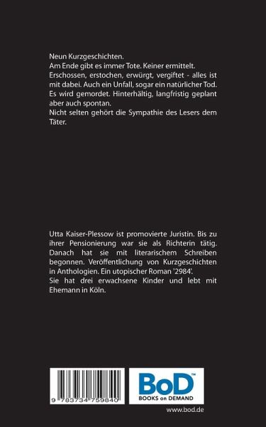 Neun Kurzgeschichten. Am Ende gibt es immer Tote. Keiner ermittelt.Erschossen, erstochen, erwürgt, vergiftet - alles ist mit dabei. Auch ein Unfall, sogar ein natürlicher Tod. Es wird gemordet. Hinterhältig, langfristig geplant aber auch spontan. Nicht selten gehört die Sympathie des Lesers dem Täter. .