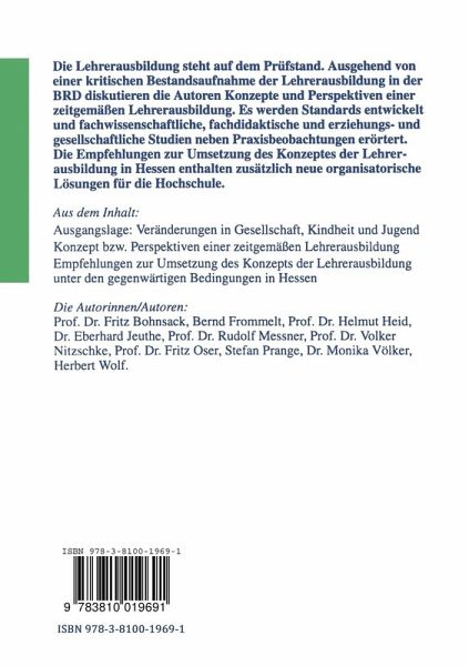 0 Auftrag und Arbeitsweise der Kommission.- 1. Ausgangslage.- 1.1 Orientierungsrahmen und Kriterien für die Beurteilung.- 1.2 Veränderungen in Gesellschaft, Kindheit und Jugend.- 1.3 Qualifikationen von Heranwachsenden.- 1.4 Schulentwicklung als Rahmenkonzept für Lehrerausbildung.- 1.5 Qualifikationen der Lehrerinnen und Lehrer.- 1.6 Konsequenzen für die Lehrerausbildung.- 2. Konzept und Perspektiven einer zeitgemäßen Lehrerausbildung.- 2.1 Kritik an der bisherigen Lehrerausbildung.- 2.2 Standards als Qualitätsmaß der Lehrerausbildung.- 2.3 Fachwissenschaftliche Studien.- 2.4 Fachdidaktische Studien.- 2.5 Erziehungs- und gesellschaftswissenschaftliche Studien.- 2.6 Praxisstudien.- 3. Empfehlungen zur Umsetzung des Konzeptes der Lehrerausbildung unter den gegenwärtigen Bedingungen in Hessen.- 3.1 Gegenwärtiger Stand der Lehrerausbildung in Hessen.- 3.2 Empfehlungen zur Umsetzung des im 2. Teil entwickelten Konzeptes der Lehrerausbildung.- 3.3 Zentrum für Bildungsforschung und Lehrerausbildung.- 3.4 Studienanteile.- 3.5 Differenzierung nach Schulstufen und Schulformen.- 3.6 Gesetzliche Neuregelungen, Weiterentwicklung der Ausbildungs- und Prüfungsvorschriften.