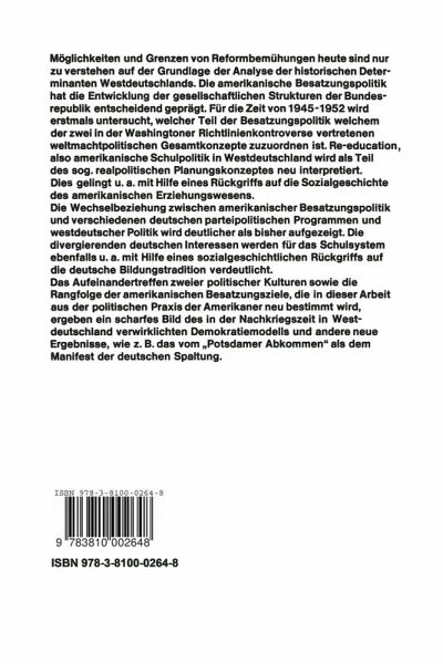 1. Aspekte der sozialgeschichtlichen Entstehung des deutschen Erziehungswesens und der Bildungsphilisophie.- 1.1. Allgemeine Entwicklungstendenzen der bürgerlichen Gesellschaft.- 1.2. Die Entwicklung des deutschen Schulsystems: der Weg vom kirchlichen zum neuhumanistischen Erziehungswesen.- 1.3. Politische Erziehung im neuhumanistischen Schulsystem.- 1.4. Deutschland ohne Tradition einer Erziehung zur Demokratie.- 2. Aspekte der Philosophie und Entwicklungsgeschichte des amerikanischen Erziehungswesens.- 2.1. Der Weg zu einer demokratischen Schulstruktur.- 2.2. Auf dem Weg zu demokratischen Inhalten (bis 1955).- 2.3. Erziehung zum Staatsbürger als Kulmination der "einzigartigen" amerikanischen Erziehung.- 2.4. Vielfältige Erscheinungsformen der amerikanischen Tradition der Erziehung zur Demokratie.- 3. Demokratisierung Deutschlands als Friedensziel der Amerikaner und ihre Besatzungspolitik.- 3.1. Grundzüge der Planung von Besatzungsmaßnahmen und Hauptlinien der amerikanischen Besatzungspolitik.- 3.2. Schulpolitik in Westdeutschland.- 3.3. Die amerkanischen Social Studies Experten und die Erziehung der Deutschen zur Demokratie.- 3.4. Demokratisierung der Westdeutschen durch die Amerikaner: eine Bilanz.- 4. Anmerkungen.- zum Kapitel 1.- zum Kapitel 2.- zum Kapitel 3.- 5. Literaturverzeichnis.- zum Kapitel 1.- zum Kapitel 2.- zum Kapitel 3.