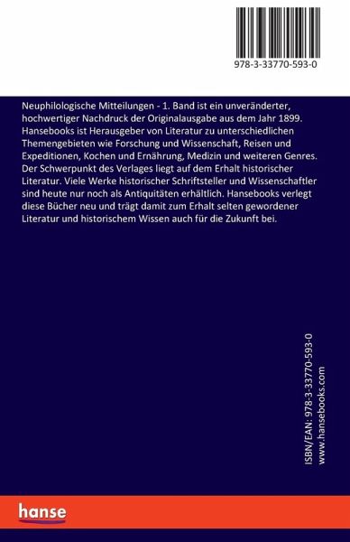 Neuphilologische Mitteilungen - 1. Band ist ein unveränderter, hochwertiger Nachdruck der Originalausgabe aus dem Jahr 1899.Hansebooks ist Herausgeber von Literatur zu unterschiedlichen Themengebieten wie Forschung und Wissenschaft, Reisen und Expeditionen, Kochen und Ernährung, Medizin und weiteren Genres. Der Schwerpunkt des Verlages liegt auf dem Erhalt historischer Literatur. Viele Werke historischer Schriftsteller und Wissenschaftler sind heute nur noch als Antiquitäten erhältlich. Hansebooks verlegt diese Bücher neu und trägt damit zum Erhalt selten gewordener Literatur und historischem Wissen auch für die Zukunft bei.