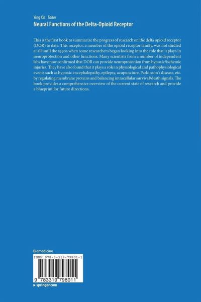 Preface.- Current research on the d-opioid receptor: From neuroprotection against hypoxia/ischemia to broad neural functions.- Recent history on delta opioid receptors and ligands: Biased mechanisms, and opioid delta-mu and delta-kappa receptor heteromers.- Evolutionary distribution of the d-Opioid Receptor: from invertebrates to humans.- Developmental distribution of the d-opioid receptor in mammalian brains.- The Role of d-opioid receptors in brain ionic homeostasis under physiological condition.- The d-opioid receptor and stabilization of brain ionic homeostasis in hypoxia/ischemia.- Regulation of membrane transporters by delta-opioid receptors.- Neuroprotective interactions between delta-opioid receptors and glutamatergic signaling mediate hypoxia-tolerance in brain.- d-Opioids and Neurogenesis.- Delta Opioid Receptor and Peptide: Hibernation for Stroke Therapy.- An important role of the d-opioid receptor in electroacupuncture-induced protection against ischemic brain injury.- Delta Opioid Receptor in Cerebral Preconditioning.- Delta-opioid receptor-mediated protection and mitochondria.- The delta-opioid system in the brain: A neglected element in Parkinson's disease?.- Are d-opioid receptors involved in deep brain stimulation?.- Acupuncture, opioid receptors and Na+ channels: A novel insight into inhibition of epileptic hyperexcitability.- Delta Opioids in Protection of the Heart and Brain.- The Various Functions of Opioids in Pathophysiological Conditions.