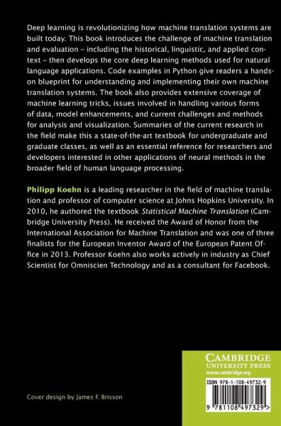 Deep learning is revolutionizing how machine translation systems are built today. This introduction to machine translation starts from the basics of neural network methods and reaches the state of the art, while giving illuminating historical, linguistic, and applied context. Code examples in Python give a hands-on blueprint for implementation.
